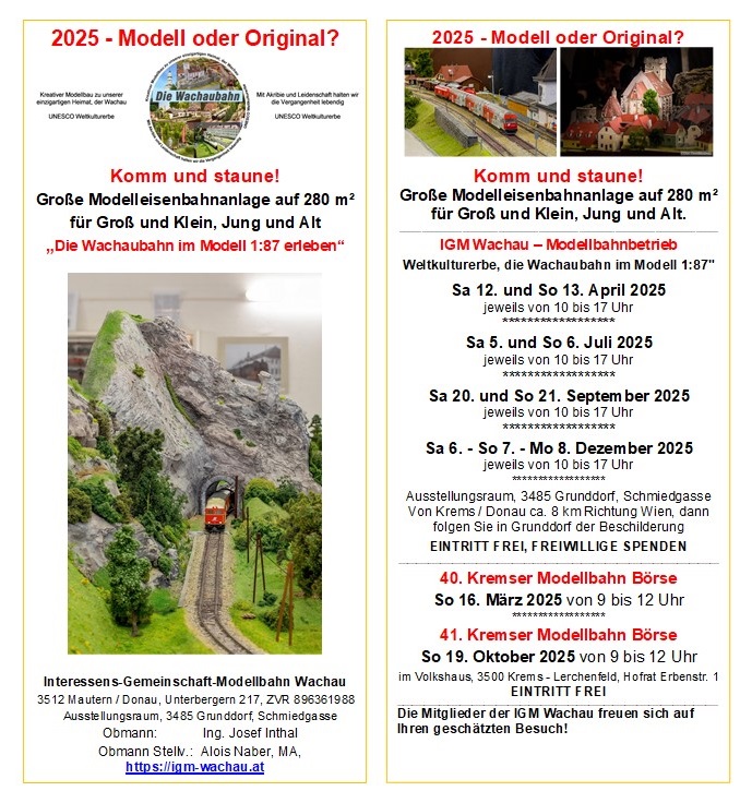Sa. 12. und So. 13. April 2025 jeweils von 10 bis 17 Uhr ........................................ Sa. 05. und So. 06. Juli 2025 jeweils von 10 bis 17 Uhr ....................................... Sa. 20. und So. 21. September 2025 jeweils von 10 bis 17 Uhr ...................................... Sa. 06., So. 07. und Mo. 08. Dezember 2025 jeweils von 10 bis 17 Uhr ![]() ...................................... Es gibt wieder VIEL NEUES auf unserer Modelleisenbahnanlage IGM Wachau Klublokal in 3485 Grunddorf, Schmiedgasse Gemeinde Grafenegg (S5 10 km vor bzw. 8 km nach Krems), folgen Sie bitte der Beschilderung "Modelleisenbahn". Eine Reise aus der Vogelperspektive von Krems bis zur Ausgrabungsstätte der Venus von Willendorf. FREIER EINTRITT - freiwillige Spenden erwünscht. Die IGM Wachau freut sich auf Ihren/Deinen Besuch