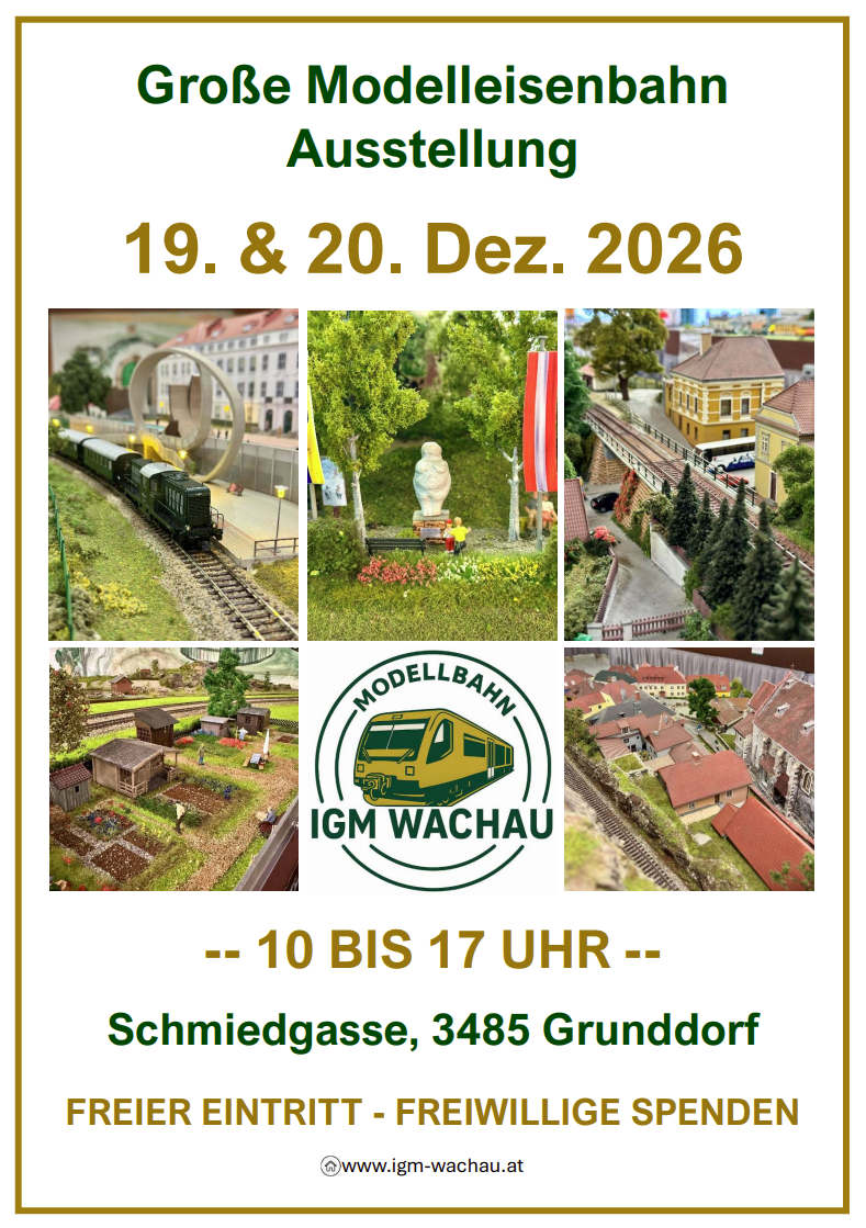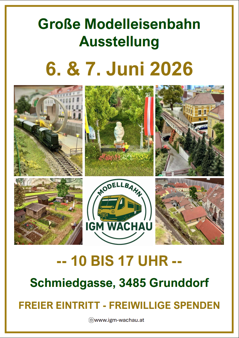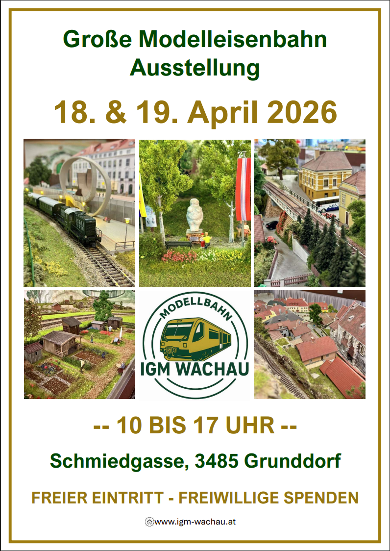 ...................................... Es gibt wieder NEUES auf unserer Modelleisenbahnanlage IGM Wachau Klublokal in 3485 Grunddorf, Schmiedgasse Gemeinde Grafenegg (S5 10 km vor bzw. 8 km nach Krems), folgen Sie bitte der Beschilderung "Modelleisenbahn". Auf mittlerweile 280 m² haben wir Streckenteile der Wachaubahn im Maßstab 1:87 mit vielen Sehenswürdigkeiten nachgebaut. Eine Reise aus der Vogelperspektive von Krems bis zur Ausgrabungsstätte der Venus von Willendorf. FREIER EINTRITT - freiwillige Spenden willkommen. Die IGM Wachau freut sich auf Ihren/Deinen Besuch!